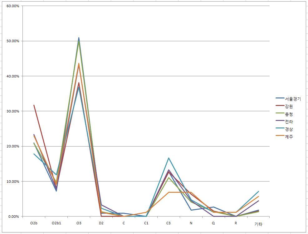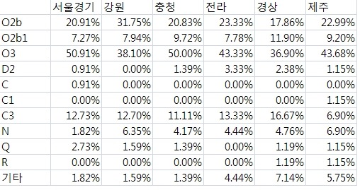 그래프를 보면 북한 지역의 자료가 없는 이상 어떤 경향성을 논하기에도 어려움이 많을 것 같다. 제주도에 C3이 적다는게 눈에 띌 정도이고 서울/경기와 충청의 O3 비율이 높다는게 조금 눈에 띄는 정도라고 할까. 그래도 그래프에서 보듯이 다른 지역의 추세선을 이탈해서 완전히 다른 종류의 분포 비율을 보여준다고 할 정도는 아닌 것 같다. 다행스럽게도 너와 내가 다르다고 말할 정도로 뚜렷한 차이점을 보여주지는 않는다.