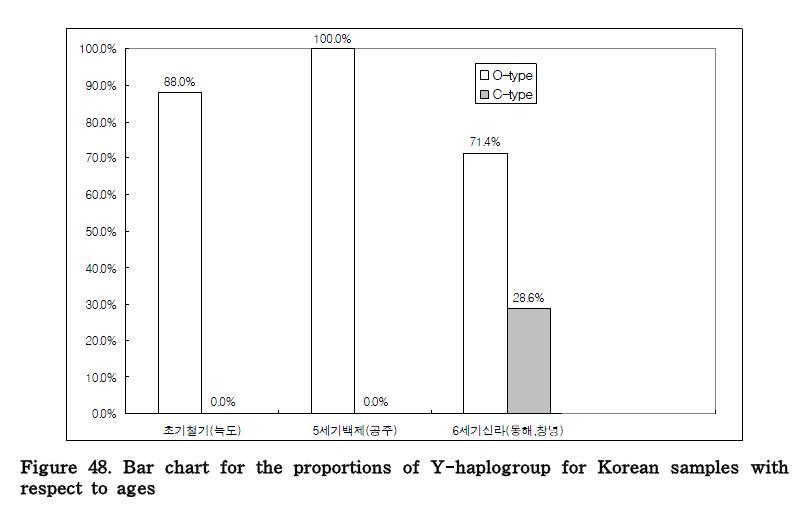 고대 한반도 출토 인골 추출 Y 염색체의 하플로그룹 구성 비율.출처, 국립문화재연구소, 한민족기원연구 용역연구 보고서 2006. p134