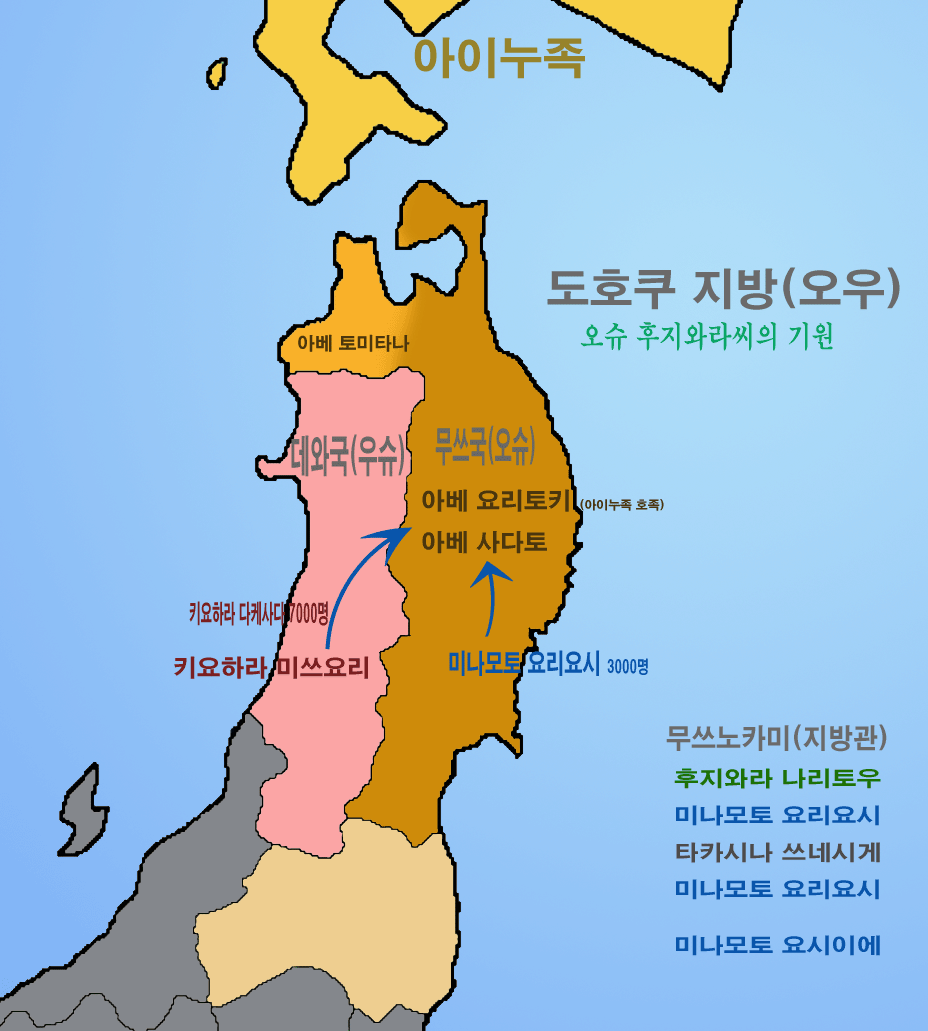 도호쿠지방의 세력이동: 아베 요리토키 ▶ 아베 사다토 ▶ 키요하라 다케사다 ▶ 키요하라 사네히라 ▶ 키요하라 키요히라ㆍ이에히라형제( 동母형제) ▶ 후지와라 키요히라(친부의 성으로 개명) 무쓰노카미: 무쓰국에 파견된 시장이나 도지사의 계급. 해당 지방 관리의 최고위직 |