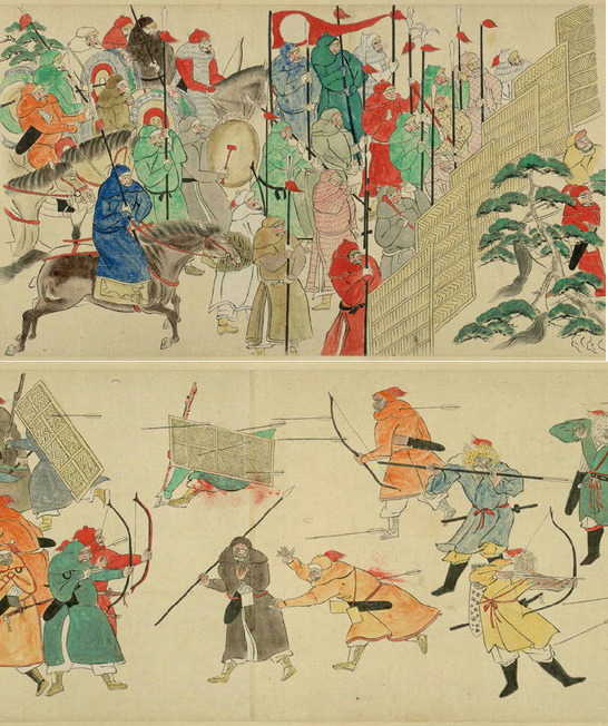 답댓글 작성자354-4475 작성시간 13.12.04 사실 자세히 보면 투구때문에 느낌이 달라서 그렇지 투구하고 군화 빼면 두 복식에 차이가 거의 없습니다. 위의 육전도 말고 해전도도 있는데 해전도를 보면 날개달린 투구를 쓴 병사들이 투구를 벗은 모습이 변발을 해서 몽골군임을 알 수 있어요. 일본에서는 날개달린 투구의 병사를 몽골군 경장병, 뒤쪽의 목가리개한 병사를 몽골군 중장병으로 보더군요.