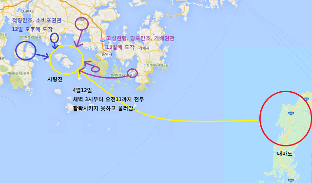 가배 권관(加背權管) 남자용(南自容), 당포 만호(唐浦萬戶) 김준(金俊), 고성 현령(固城縣令) 봉귀달(奉貴達) 등은 다음날인 13일에나 도착하였습니다.
