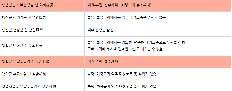 3. 아니 뭐, 불명이라고 써넣은 사람들이 다 익주 출신일지도 모르지 않느냐, 라고 질문하실 수 있지요. 물론 그럴 수 있습니다. 하지만 이들의 성은 익주 대성호족을 기록한 화양국지에서 전혀 언급되지 않는 성입니다. 대성호족은 지역에서 가장 힘있는 호족들이라고 읽어 주시면 되는데, 촉은 북벌이라는 거대한 군사사업에 나서면서 이렇게 '힘 센 호족'들에게는 전혀 지휘권을 나눠주지 않았고, 비교적 세가 약한 익주인에게만, 중하위 직위에 한정해서, 전체 군 지휘관중 절반이 넘지 않게, 한정적인 지휘권만을 준 셈입니다. 높은 지위도 없고 비율이 많은 것도 아니고 익주에서 본래 강성한 이들도 아니니 철저히 형주계에게 목줄이 잡혀 있는 셈이라 볼 수 있지요.
