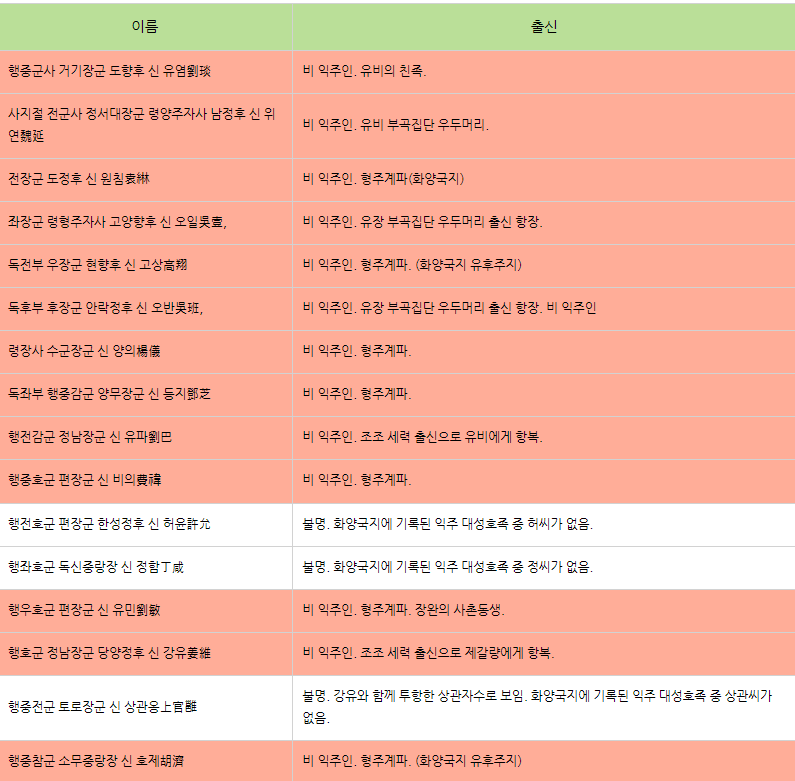 2. 앞선 글에서 살펴보았듯 한중 막부는 유비 휘하의 형주 출신 호족들이 주축이 되었습니다. 촉은 익주에 성립된 정권인데 왜 익주 출신이 배제되냐면, 그거야 당연하지요. 촉 자체가 유비라는 외래인이 외래 군사력을 끌고 들어와 익주인들을 쳐죽이며, 그 시체 위에 일궈낸 외래인 정권이니까요. 익주인들에게 윗자리를 내주자니 불안할 수밖에 없는 겁니다. 이전 글에서 사용한 표를 다시 가져와 봅시다.