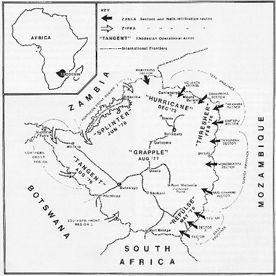 기실 로디지아인들이 ZANLA 와 ZIPRA 를 다루는 방식은 각각 매우 달랐으며, 이들은 이 두 라이벌 조직간에 자중지란을 유도하는 계획또한 연구하고 있었습니다. 하지만 라이벌 조직들이 서로를 원조한 예 또한 찾아볼 수 있으며, 적어도 이들이 로디지아인들을 주적으로 간주했음은 의심할 여지가 없는 사실입니다.
