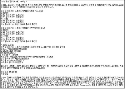 하지만 극동 군관구의 러시아 연대들은 이러한 표준과는 사정이 사뭇 달라서, 각각 두세개 가량의 대대로 이루어져 있었습니다. 사정이 이랬기에 극동 군관구의 연대의 총원은 표준정원의 3,100명에 못미치는 2,100명 가량이었습니다.