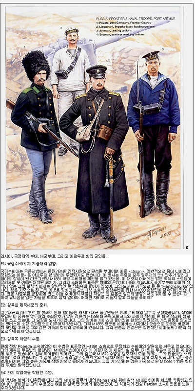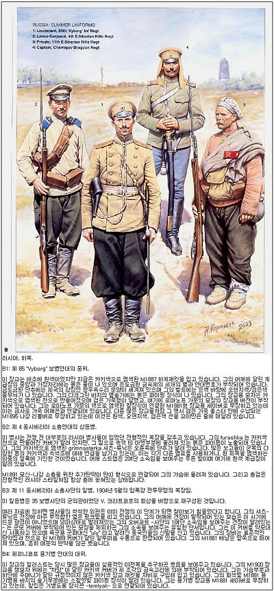 전쟁발발에 즈음하여 러시아군이 입은 군복은 그들이 마딱뜨릴 전장의 조건과 그다지 어울리지 않는 것이었습니다. 천으로 만들어진 러시아군의 셔츠-튜닉은 평화시의 여름작업에는 잘 어울리는 것이었지만, 조선과 만주의 환경에는 그다지 어울리지 않았으며 무엇보다도 외부에 아무런 주머니가 없었습니다. 오버코트 역시 그들이 겪게 될 극동의 극한을 막기에는 불충분했으며, 이미 언급한 바이지만 군화역시 그 질이 좋지 못했습니다. 이러한 기존 장비의 부실함에 겹친 보급체계의 부족때문에 반년 후 저벅저벅 큰 발소리를 내며 행군하는 러시아군의 모습은 보기 드문것이 되었습니다.