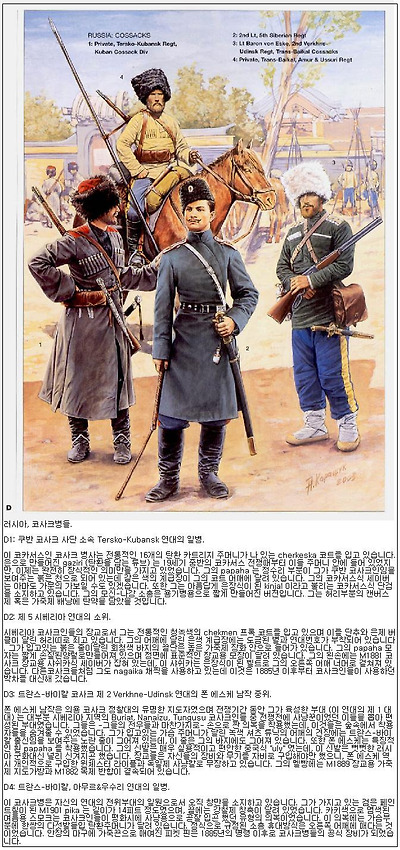 전쟁기간 동안 이러한 규정복장 이외에도 여러 다양한 복장들이 코사크 병사들에 의해 착용되었습니다 (플레이트 D 참조) . 그들은 전통적으로 스스로의 장비와 무장을 갖출 의무를 지고 있었기에, 그 복장들의 세부사항은 매우 다양했습니다. 그들은 일반적으로 1891년형 용기병용 기병총으로 무장했으며, 여기에 비 코카서스 출신 병사들은 M1881형 "코사크식" 세이버 (샤쉬카) 을 소지하고 있었습니다.