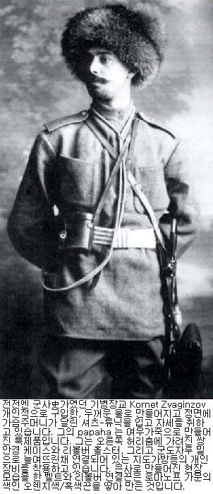 두 코카서스 부족 출신의 코사크병들은 무릎까지 내려오는 cherkeska 라고 불린 카프탄 스타일의 코트를 입었으며, 그 안에는 beshmet 이라고 불린 긴 내의를 입었습니다. 코트의 가슴부분에는 탄환폴더 장식이 노출되어 있었습니다. cherkeska 의 어깨 스트랩의 색 역시 지역마다 달랐으니, 쿠반 코사크들은 스칼렛, 데렉 코사크들의 것은 밝은 푸른빛이었습니다. 정면의 단추로 고정되는 beshmet 역시 착용자의 출신에 따라 색이 달랐을 것으로 보입니다. 검은 헐렁헐렁한 바지에는 역시 출신지역에 따른 넓은 끈장식이 달려 있었으며, 그 끝은 코사크식 장화안으로 들어가 있었습니다. 코카서스 출신의 코사크 포병대원들은 도금된 금속뱃지가 달리고 가장자리가 붉은색 선으로 마감된 검은 beshmet 을 입었습니다.