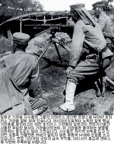 일본인들 역시 전쟁 즈음에는 비교적 적은 수의 기관총을 일선부대에 장비하고 있었지만, 얼마 지나지 않아 그 수를 늘릴 필요성을 느꼈습니다. (일본군들은 압록강 전투에서 몇대의 러시아군 맥심기관총을 노획한 후, 그 옛 주인들을 상대로 사용하기도 했습니다.) 일본군은 1900년에 있었던 의화단의 난 때 프랑스제 호치키스 M1897 기관총을 접할 기회가 있었습니다. 일본은 얼마 뒤 이 기관총의 생산 라이센스를 취득한 후, 도쿄의 공장에서 생산에 들어갔습니다. 몇달 후 전쟁이 터졌을 때 각각의 일본군 사단은 24대의 기관총 (기관총은 사단장의 직접적인 지휘하에 놓여 있었습니다.) 을 보유할 수 있었으며, 전쟁을 통해 이 무기의 유용성이 확인되면서 많은 일본군 장교들이 기관총의 사용규모를 두고 열띤 논쟁을 벌이기도 했습니다.