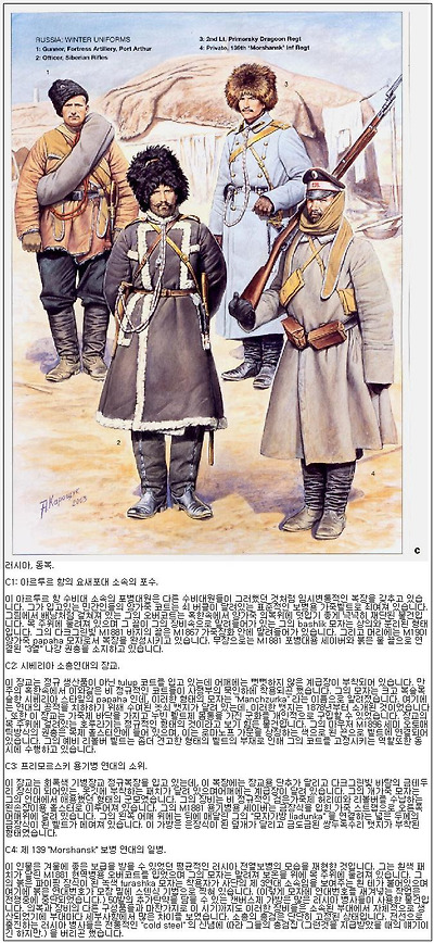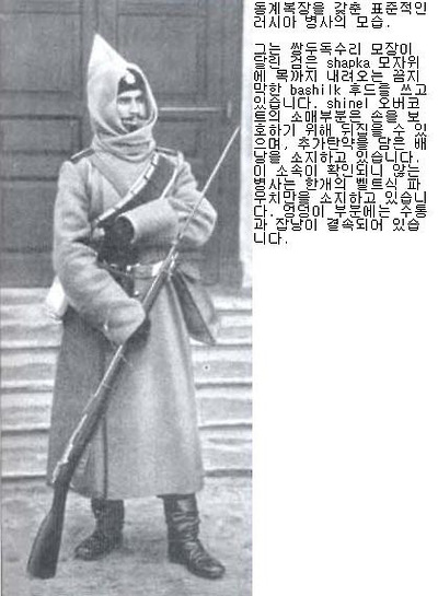 동계 군복은 종류에 따라 다양한 외관을 가지고 있었으며, 그에따른 효과또한 다양했습니다. 러시아 육군은 1904년 가을에 있었던 요양 전투이후에 뒤이은 퇴각과정에서 병사들의 오버코트를 포함한 엄청난 양의 군수장비들을 잃어벼렸습니다. 곧이어 혹한이 닥쳐오자 러시아군은 방한을 위한 임시변통으로 입수가능한 옷가지를 닥치는대로 걸쳤습니다. 다행히 쿠로파트킨 장군은 필요하다면 군복에 관한 규율위반정도는 적당히 눈감아줄 정도의 융통성이 있는 사람이었기에, 러시아군 전역에서 얼마간 색다른 복장을 갖춘 병사들이 눈에 띄게 되었습니다. 어쨋든 12월 중반까지는 육군 전체가 어떠한 방법을 통해서든 겨울 코트와 양털제, 혹은 가죽제 군모와 펠트제 군화를 갖출 수 있었으리라고 생각됩니다.