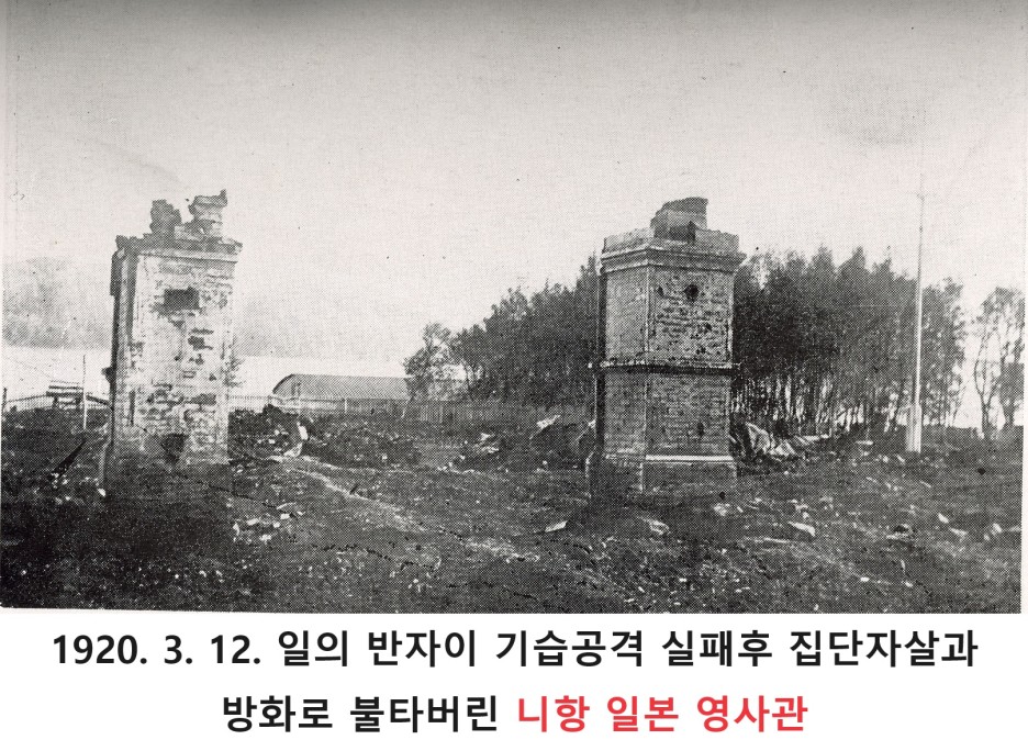 ◆ 1920년 4월 4일부터 5일 밤에 일본군에 의해 연해주 각지에서 러시아 혁명 세력과 한인들에 대한 대대적인 학살과 공격이 단행되었는데, 이는 니항사건에 대한 일본군의 보복적 만행이었다.