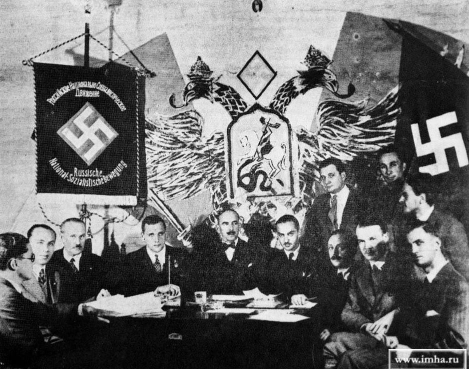 러시아계 파시스트당 당수와 백파계 러시아인들이 보인다. 나치 독일의 표식도 보인다.... 러시아 파시스트의 일부는 독일 나치당의 이념을 공유하였다.