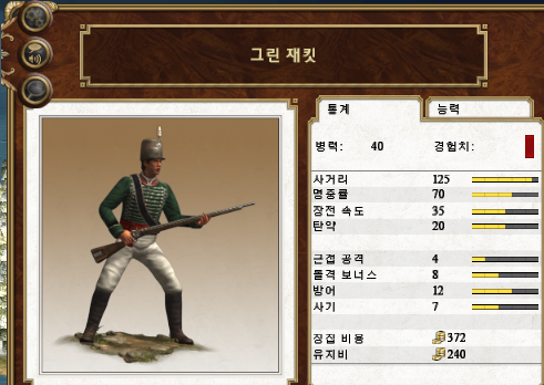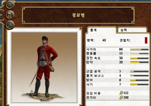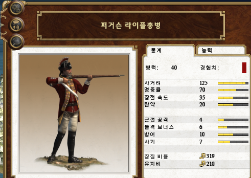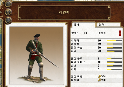 일반적인 경보병에 비해 명중률과 사기가 떨어지는 대신 장전 속도와 방어가 약간 높습니다.