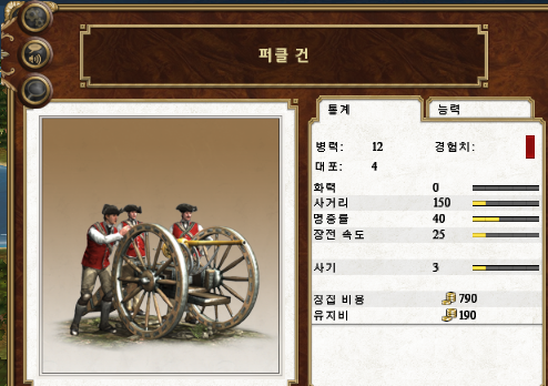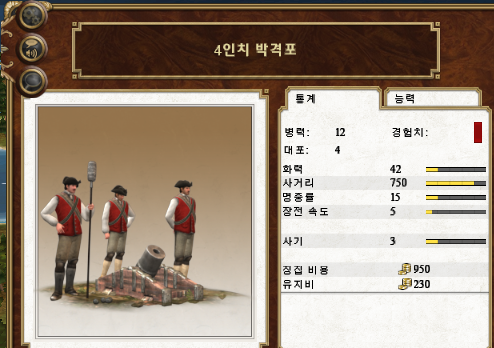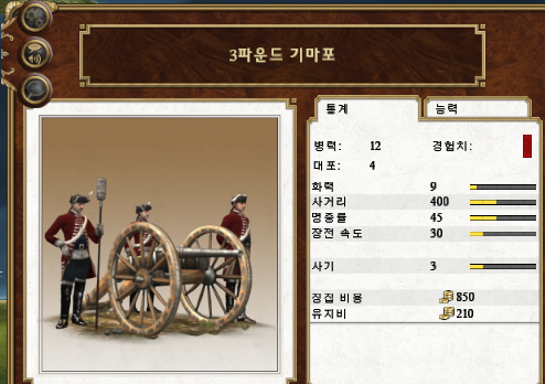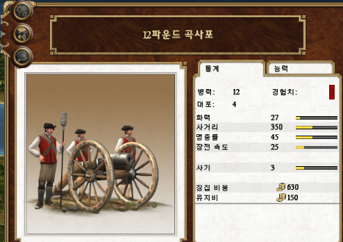 능력 : 곡사 가능, 충격탄, 생석회탄 (24파운드는 화력 40, 명중률 40)