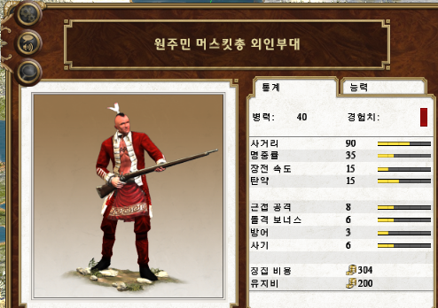 아메리카 지역에서 고용 가능한 원주민 경보병입니다. 총독의 저택만 지으면 바로 나오기 때문