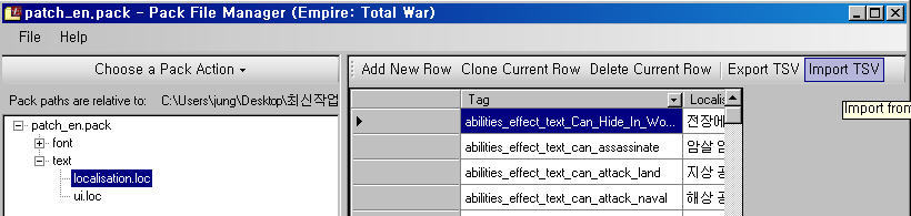 patch_en.pack 의 text 폴더안에 한글로 수정한 localisation.loc.tsv , ui.loc.tsv 두파일을 import 해주시는 겁니다.