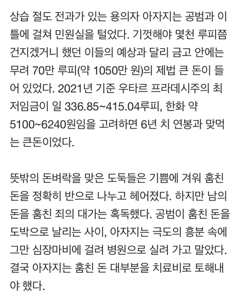 [놀라운 세상]훔친 돈 생각보다 너무 많아 놀라서 심장마비온 인도 도둑 작성자커피매니아|작성시간21.04.09|조회수297 목록 댓글 1 글자크기 작게가 글자크기 크게가 http://naver.me/xC6GGju3“훔친 돈 생각보다 많아” 놀란 印 도둑 심장마비…목숨 내놓을 뻔[서울신문 나우뉴스] 인도 좀도둑이 남의 돈을 훔친 업보를 톡톡히 치렀다. 1일 타임스오브인디아는 예상치 못한 큰돈을 손에 쥐고 놀란 좀도둑이 심장마비에 걸려 하마터면 목숨을 잃을 뻔했다n.news.naver.comㅎㄷㄷㄷ 다음검색 현재 게시글 추가 기능 열기 북마크 신고 센터로 신고 댓글 댓글 1 댓글쓰기 답글쓰기 댓글 리스트 작성자BACCANO | 작성시간 21.04.09 이름이 아!자지 댓글 전체보기