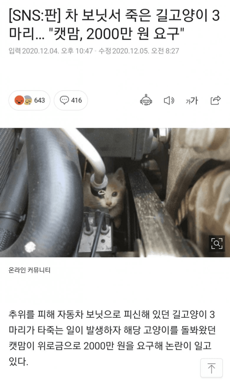 +차주는 100만원을 캣맘한테주고 고양이를 법적으로 실질적 주인 만든뒤 자동차 수리비청구해서 역관광했다함