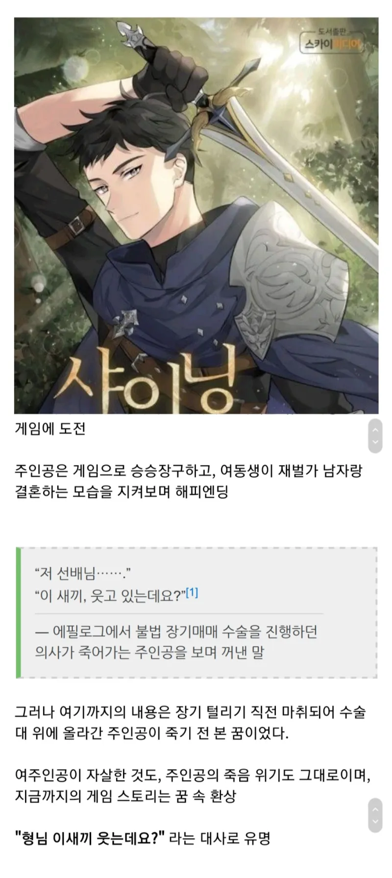 알고보니 회귀는 없었고 여동생이 자살한것도 그대로고 그냥 장기적출 중에 주인공이 꾼 꿈이었음 ㄷㄷ