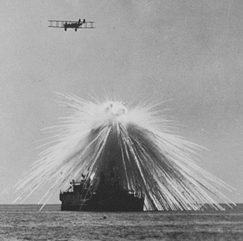 -빌리 미첼이 조종하는 항공기가 전함을 상대로 폭격 실험을 하고 있다-