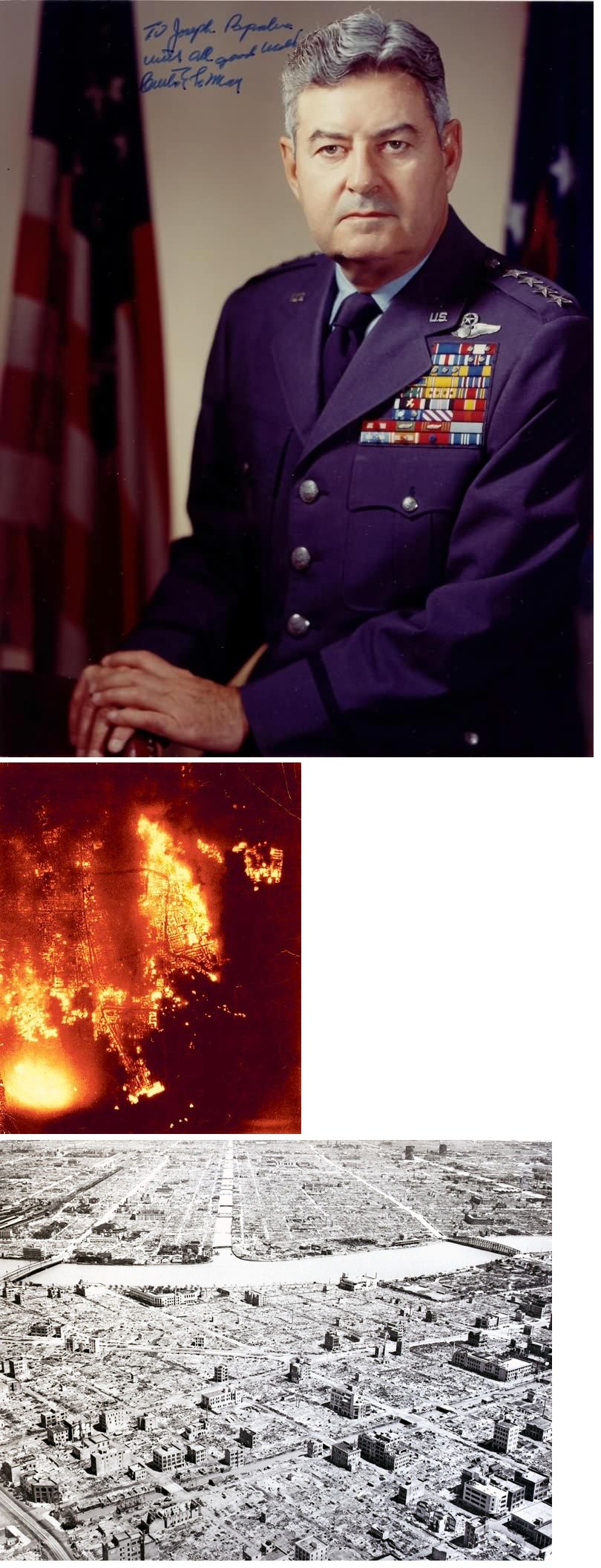 짤방은 매눈을 한 석기시대 매니아 르 메이 장군과 그가 연출한 도쿄 핫 44년 3월의 동경폭격. 그는 전쟁 내내 본국에서 교토를 폭격하지 못하게 한다(원자폭탄 표적 선정 위원회의 위원장이 대단한 일본빠라 그의 독단으로 폭격목표에서 교토만 제외됐다)고 화를 냈음.