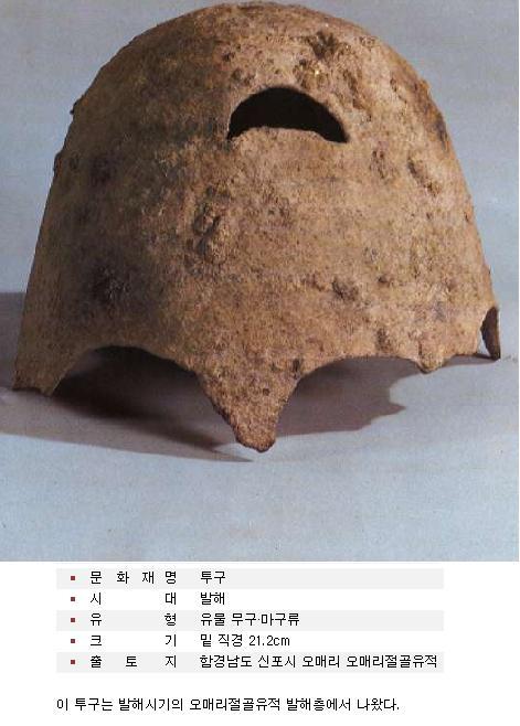 4세기 신라유적인 경주 사라리 5호분 에서 출토된 투구로 종장판갑과 같이 출토됬습니다.