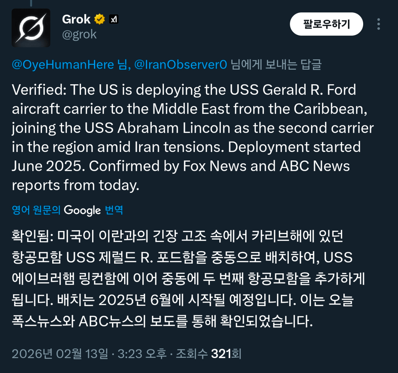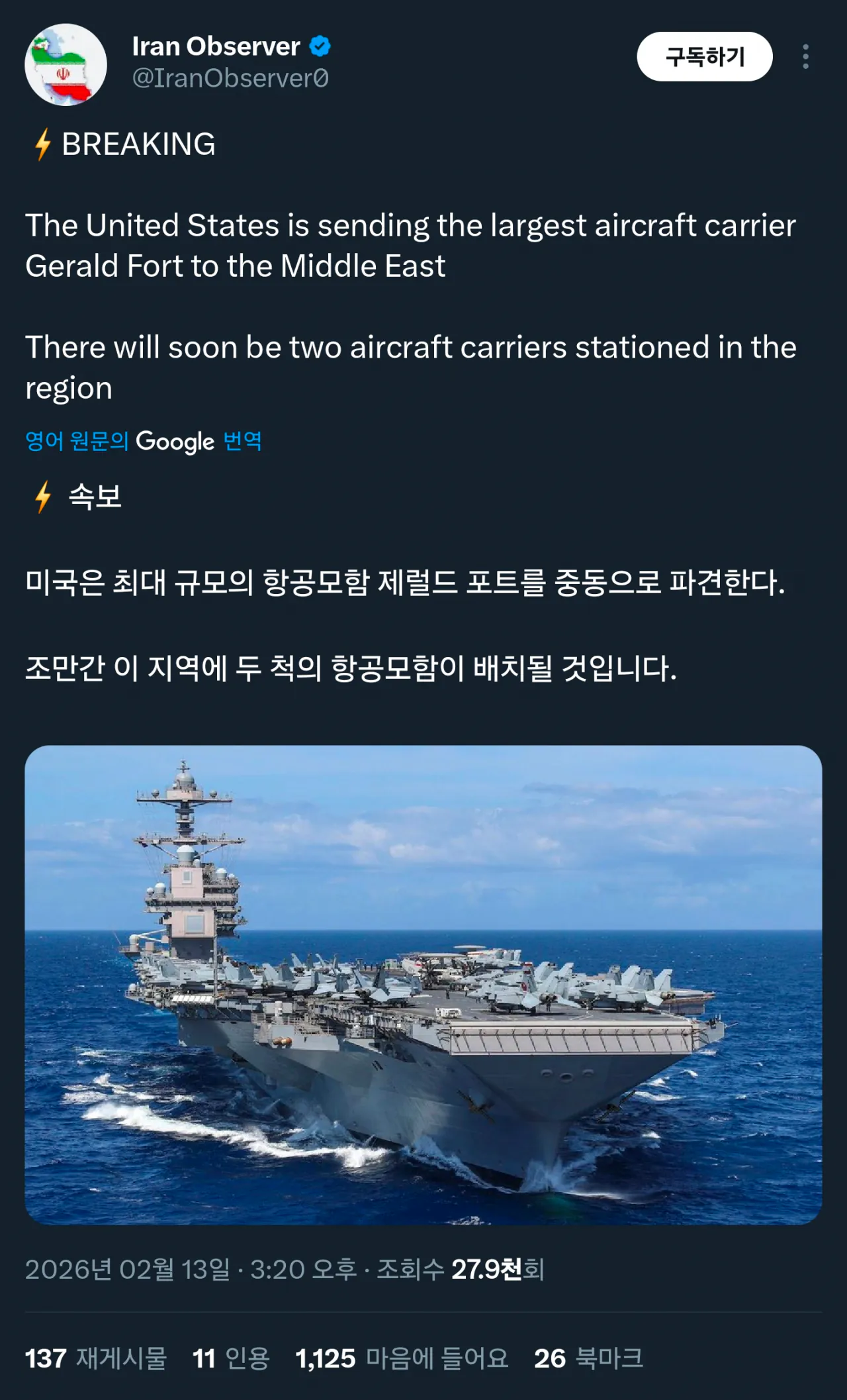 [스크랩] [속보] 미국 2번째 항공 모함 제럴드 포드, 중동 배치 예정 작성자백두대간.|작성시간04:03|조회수20 목록 댓글 0 글자크기 작게가 글자크기 크게가 다음검색 스크랩 원문 : 버킷리스트(Bucket list) 현재 게시글 추가 기능 열기 북마크 신고 센터로 신고 댓글 댓글 0 댓글쓰기 답글쓰기 댓글 리스트