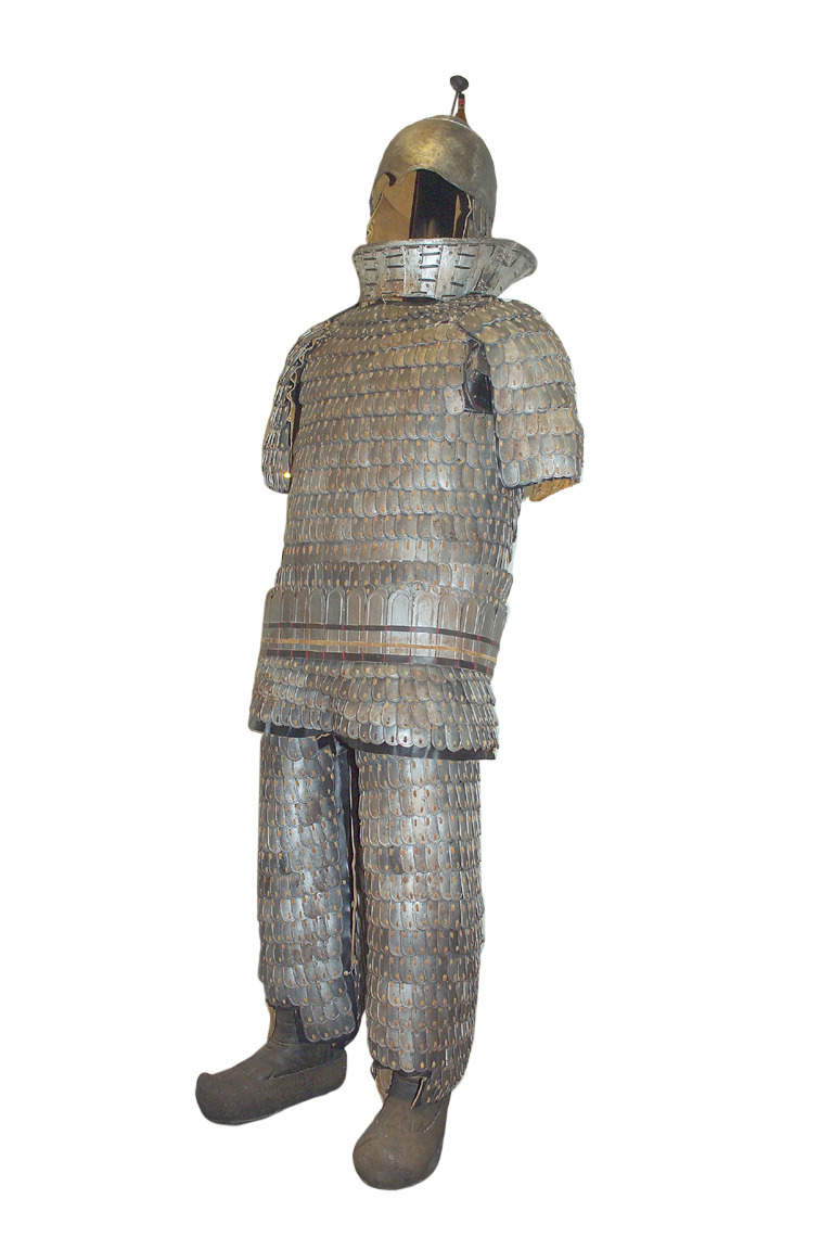 아무래도 청동기 시대 각종 문명~문화권 등에서 발견되는 내중식 스케일아머1)의 약점을 보완하는 과정에서 새로 발생한 형태로 보입니다. 세이마-뚜르빈 문화에서 출토된 유물처럼 아래에서 위로 찌르는 공격을 막기위해 연결끈 등으로 갑찰아랫쪽도 묶어서 고정하던 것이 그 시초가 된 것이 아닌가 추정됩니다.