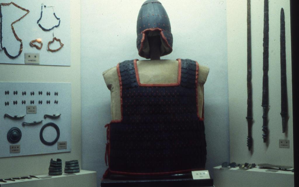 한나라계 내중식 찰갑으로 신갑(몸통부위)은 소찰혁결(내중식 갑찰의 상하연결기법으로 유연성이 적은 연결기법, 주로 한족계 갑옷에 많이 쓰이는 것이 확인됨)기법으로 만든 한나라시기의 찰갑입니다. 그렇지만, 부속갑은 북방유목민족들(주로 흉노)의 영향을 받아 소찰수결(유연성이 높은 외중식 가죽끈연결기법)기법으로 만든 경우가 많습니다. 한나라와 주변 민족들과의 군사적 교류를 알 수 있는 찰갑종류입니다.