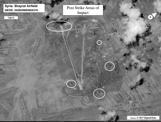 4월 6일, 트럼프 대통령은 토마호크 대지 공격 미사일 (TLAMs) 공격 방안을 선택합니다. 이에 대해 군 당국은 "상응하는 내용" 스탠드 오프 공격 때문에 "최소한 위험의 공격" 이라고 설명했다. 시리아 국내의 러시아 군에 고성능 방공 장비가 있기 때문에 군은 유인 전투기를 위험한 상황에 보내고 싶지 않았다. 러시아는 TLAMs을 요격하지 않았다. "대통령은 알 샤이랏 비행장 공격을 결정했다. 6일 오후 안전 보장 회의에서 이 선택을 결정했다"고 관계자는 보도진에 설명했다. "같은날 6일 오후 4시 30분쯤 대통령 명령을 받았다. 대통령 명령은 국방 장관을 통해 중앙군 사령부에 전해져 작전이 실시되었다. 수령후 4시간 후 TLAM 59발이 발사되었다. 동부 표준시 어제 8:40 무렵의 일이다."