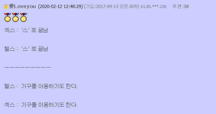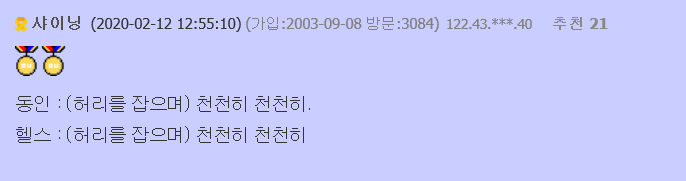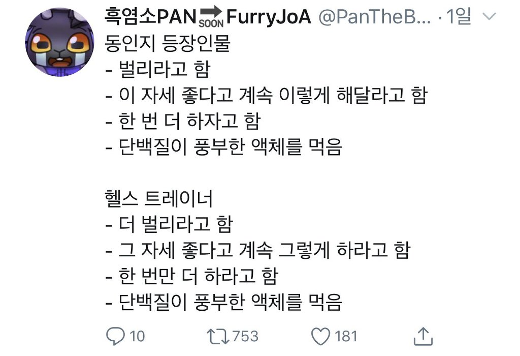 [스크랩] 19) 헬스와 히토미의 공통점.jpg 작성자Neogul|작성시간20.02.13|조회수827 목록 댓글 3 글자크기 작게가 글자크기 크게가 * 업로더 유의사항 : 정치, 성혐오, 광고, 분쟁성, 어그로 게시물 금지* 댓글러 유의사항 : 정치, 성혐오, 광고, 분쟁성, 악플, 어그로 댓글 금지* 웃긴자료 게시판 업로드 치킨이벤트 진행중 다음검색 스크랩 원문 : 도탁스 (DOTAX) 현재 게시글 추가 기능 열기 북마크 신고 센터로 신고 댓글 댓글 3 댓글쓰기 답글쓰기 댓글 리스트 작성자푸른잎새 | 작성시간 20.02.13 ㅋㅋ아씨 다 이해했어 짜잉나 작성자데미르 | 작성시간 20.02.13 추가 힙드라이브.여러분 인생 모르는거니 헬스하십셔.기회가 온다면 경운기가 아니라 람보르기니 엔진으로 가야되지 않겠습니까? 답댓글 작성자눈망울촉촉 | 작성시간 20.02.13 저도 어제부터 헬스 다닙니다 여기 좋은 머신이 많네요 댓글 전체보기
