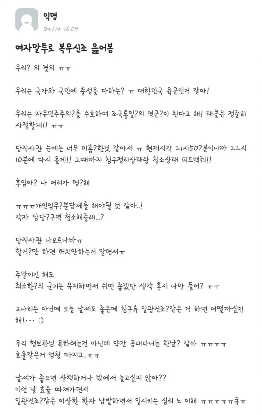 [스크랩] 여초 말투로 복무신조 읽기.jpg 작성자가터벨트백작|작성시간22.05.25|조회수436 목록 댓글 0 글자크기 작게가 글자크기 크게가 ㅁㅊㅋㅋㅋㅋㅋ 다음검색 스크랩 원문 : 도탁스 (DOTAX) 현재 게시글 추가 기능 열기 북마크 신고 센터로 신고 댓글 댓글 0 댓글쓰기 답글쓰기 댓글 리스트