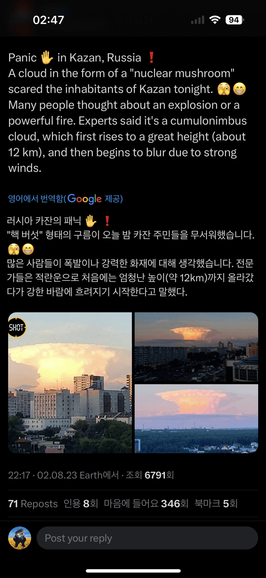 [스크랩] 러시아 카잔에서 거대 버섯구름 관측 작성자가터벨트후작|작성시간23.08.03|조회수392 목록 댓글 5 글자크기 작게가 글자크기 크게가 거대한 버섯모양의 적란운..... 창밖으로 봤으면 ㄹㅇ 식겁했을듯 다음검색 스크랩 원문 : 도탁스 (DOTAX) 현재 게시글 추가 기능 열기 북마크 신고 센터로 신고 댓글 댓글 5 댓글쓰기 답글쓰기 댓글 리스트 작성자프리드리히대공 | 작성시간 23.08.03 대규모 폭발로 발생하는 구름하고는 모양이 다르다는 느낌은 있는데 그래도 흠좀무 하죠 작성자제우스리가 | 작성시간 23.08.03 핵무기 터지는줄 알았습니다 작성자몰라요 | 작성시간 23.08.03 ㅎㄷㄷ 작성자RichardDawkins | 작성시간 23.08.03 뭐랄까 광대버섯하고 송이버섯 차이 같은..ㅋㅋㅋ 작성자waterloo | 작성시간 23.08.03 순간 식겁 ㅎㄷㄷㄷ;; 댓글 전체보기