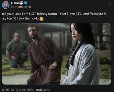 "그대들의 주군들께 말해두거라. 나는 조니 소말리가 아니다, 난 BTS(군인 출신 분들 도와주세요) 좋아하고,