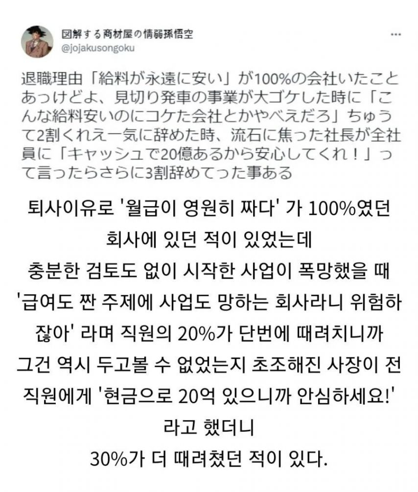 [스크랩] 사장의 한마디로 ㅈ된 일본의 어느 회사 작성자가터벨트후작|작성시간24.11.05|조회수330 목록 댓글 3 글자크기 작게가 글자크기 크게가 있는데 안줬어??? 다음검색 스크랩 원문 : 도탁스 (DOTAX) 현재 게시글 추가 기능 열기 북마크 신고 센터로 신고 댓글 댓글 3 댓글쓰기 답글쓰기 댓글 리스트 작성자soublaki | 작성시간 24.11.05 20억 ‘엔’ 작성자밸틴1 | 작성시간 24.11.05 어느나라건간에 사업 개판으로 하면 망하죠. 작성자황초롱이 | 작성시간 24.11.05 헐 댓글 전체보기