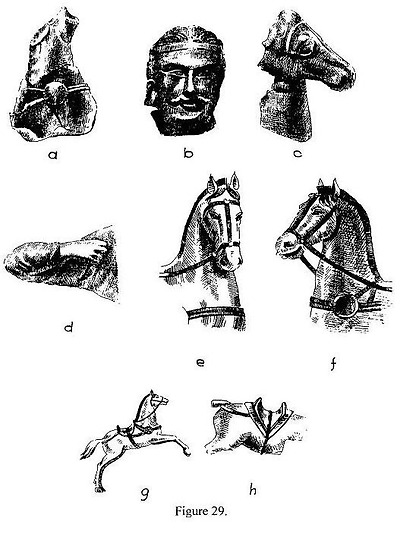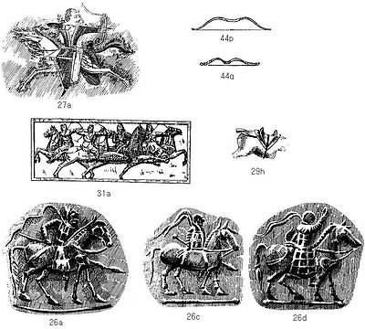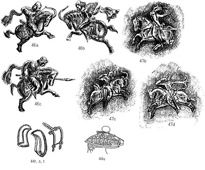 그가 타고있는 말의 금속제 재갈이 재갈끈과 굽은 뺨 가리개가 달린 입 양쪽의 재갈로 이루어졌다는 점은 특기할 만 합니다. 말을 좀더 가혹하게 통제하기 위한 이러한 형태의 재갈의 실제 유물은 이란 남서부의 수사 지역에서 발견되었는데, 이는 기원후 4세기 경의 물건으로 추측됩니다. 이 외에도 3세기의 사산조 페르시아의 유물인 Fig 44r-t, 44u 역시 한번쯤 눈여겨 볼만 합니다.