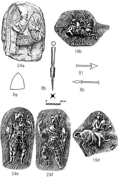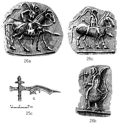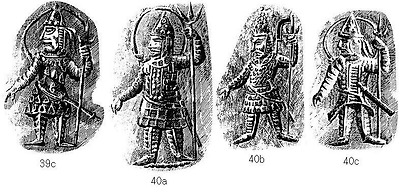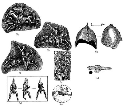 기병 (1C) 은 출토된 은판 (Fig 3a-c) 에 묘사된 귀족출신의 사냥꾼을 그린 그림에 기초한 것입니다. 그는 짧고 허리까지 내려오는, 즉 메디아인들이 입은 기수의 옷 (Fig 4d,e) 을 입고 있는데, 그 상의는 귀금속으로 장식되어 있습니다. 그의 무기는 근접전을 위한 단창, 그리고 "스키타이" 스타일의 활과 전통으로 이루어져 있습니다. 한편 그가 타고있는 말의 갈기는 활을 쏘는데 방해가 되지 않도록 묶여 있습니다. 기수는 말 잔등위에 아주 화려한 장식이 된 안장을 깔고 말을 탔습니다.