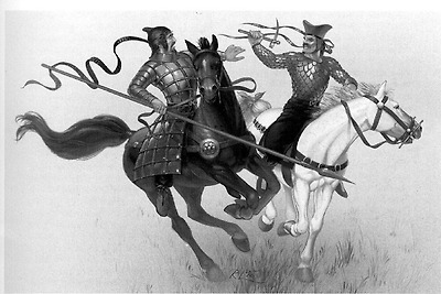 이 그림은 동전에 묘사되어 있는, 그리스인들 다음으로 박트리아와 그 인근지역을 통치한 스텝 출신 유목민들의 상급 전사들을 재구성한 것입니다. 비록 실제로는 이 두 전사들이 등장한 시기가 일치하지 않습니다만, 우리는 약간의 예술적인 상상력을 발휘하여 좀더 이전의 지배자가 자신의 후임자에 의해 축출되는 모습을 그려 보았습니다. 좌측의 중기병 -카타프락타리오스- 의 모습은 이른바 인도-사카인들의 군주인 Spalirises 의 모습이 새겨진 동전 (Fig 26a) 에 기초한 것입니다. 동전에 묘사된 그는 다른 인도-사카 군주들처럼 (Fig 26c) 머리에 금속제 투구를 착용하고 있지 않고 있으며, 대신 전형적인 유목민들의 모자인 바실리크 bashlik 스타일의 모자를 쓰고 있습니다. 그는 천이나 가죽으로 안감을 대고, 바깥에는 큰 사각형 철편으로 방호되며, 고리모양의 칼라가 달린 아주 긴 장갑코트를 입고 있습니다. 이 코트는 그 기수가 말에 타기 쉽도록 앞과 뒷부분 모두 트여져 있습니다. 또한 그의 팔은 튜브 형태의 보호대에 의해 보호받고 있습니다. 그의 무장은 전형적인 카타프락터들의 무장인 3.0-3.5 미터 길이의 무거운 창입니다.
