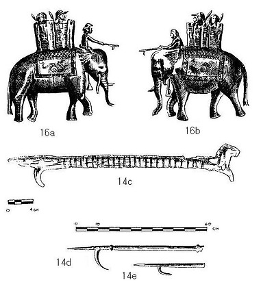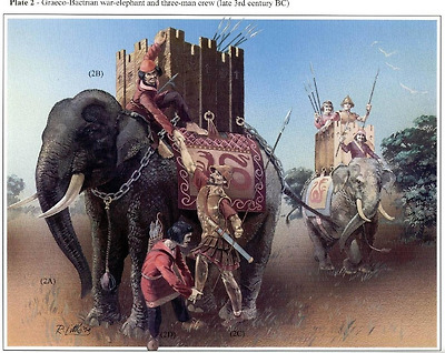 여기 그려진 전투 코끼리와 세명의 승무원들은 현재 상트-페테르부르크의 에르미타쥬 박물관에 소장되어 있는, 그리스계 박트리아인들의 작품인 은제 훈장 phalerae 에 새겨져 있는 묘사를 바탕으로 재구성한 것입니다. (Fig 16 a,b) 여기 묘사된 코끼리는 인도 코끼리인데 그 허리 위에는 널판지로 만들어진 탑이 올려져 있으며, 탑 외부는 아마도 금속제로 추정되는 화살과 십자가 모양의 장식으로 꾸며져 있습니다. 그리고 탑에는 전투에서 적을 향해 던지기 위한 투창이 실려 있습니다. 탑 밑에는 탑과 코끼리 등 사이를 잘 맞물리게 하기 위한 안장이 놓여져 있는데, 이 안장은 용 무늬로 장식되어 있습니다. 탑은 안장 밑으로 연결되는 거스 스트랩과 굵은 철제 체인으로 단단히 고정되어 있습니다. 아마도 인도인으로 추정되는 조종수 (2B) 는 가벼운 복장을 하고 있습니다. 코끼리 조종을 위한 장비인 철제 갈고리는 실제 유물 (Fig 14 c-e) 을 바탕으로 재구성한 것입니다.