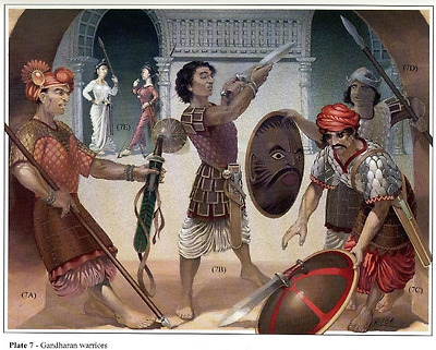 이 시기에 만들어진 많은 간다라 예술작품들은 부처의 삶에 관한 것입니다. 여기에는 그가 궁전을 나온 것과 (우리는 이 일화에서 힌트를 얻어 여성 궁전 근위대를 재구성해 보았습니다.), 사악한 마라 Mara 와의 대결등을 묘사한 것 등이 있는데, 이 일화는 우리가 무시무시한 얼굴이 그려진 방패로 무장한 보병 전사 (7D) 를 재구성하는데 도움을 주었습니다. 아마도 어떤 이들은 이러한 방패가 그저 "판타지적인" 물건일 뿐이라고 여길지도 모르겠습니다만, 이러한 문양들이 실제 전사들의 방패에 장식되었을 가능성은 상당히 높습니다.