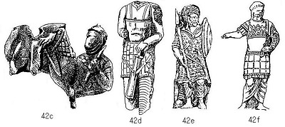 카타프락타리오스 (4C) 는 Khalchayan 지역의 조각품 (Fig 30) 을 기초로 재구성한 것인데, 우리의 재구성은 전사의 다리 보호대나 마갑 등등의 디테일에 있어 G.A.Pugachenkova 가 발견한 좀더 초기의 유물에 관한 묘사와 다소 다른 점이 있습니다. 기수의 긴 갑주와 팔 보호대는 인도-사카인들의 동전들 (Fig 26 a,c,d) 에서 묘사되는 바를 기초로 재구성한 것입니다. 그가 쓰고 있는 이른바 "산봉우리" 스타일의 투구는 앞부분이 낮고 그 뒤쪽에 볏 장식이 달려 있으며 이마 부분에 뾰족한 챙과 뺨 보호대가 달려 있었습니다. 아주 작은 유물의 파편 (Fig 30) 을 기초로 재구성된 다리 보호대는 두 부분으로 이루어져 있습니다. 윗부분은 강철제 관으로 만들어진 짧은 "튜브" 형태를 이루고 있으며 이는 넓적다리를 보호하고 그 아랫부분이 무릎까지 내려오고 있습니다. (사실 Khalchayan 지역의 유물에서 추측가능한 갑주는 인도-사카인들의 그것보다 약간 짧기 때문에 넓적다리 전체를 다 가리지는 못합니다.) 다리 보호대의 다른 부분은 철제 스케일 아머로 만들어져 있으며 그 중앙 부분은 어두운 가죽으로 되어 있는데, 이 부분은 생선가시 모습을 본딴 철편에 의해 보강되어 있습니다. 이러한 카타프락타리오스의 외양의 재구성은 기실 매우 불확실한 것이라는 것을 언급해 두어야만 하겠습니다. 조각 (Fig 30 c,d) 에서 미루어 알수 있는 마갑은 세 부분으로 이루어져 있습니다.: 청동 스케일로 만들어진 두부 가리개와, 안감으로 천이나 가죽을 댄, 청동제 스케일로 만들어진 목가리개 (그리스인들이 Peritrakhelion 라고 부른), 그리고 우리의 추측에 의해 재구성된 목가리개와 같은 구조로 된 몸통 갑옷이 그것입니다. 목가리개와 몸통 갑옷은 가죽 끈으로 서로 단단히 연결되었습니다. 비록 조각상에는 이 중기병의 공격무기 부분이 소실되어 있지만, 이들 역시 다른 일반적인 카타프락트들처럼 무거운 기병창 contus 과 장검으로 무장하고 있었을 겁니다.