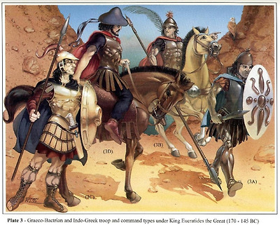 에우크라티데스 Eucratides 대왕 (재위 기원전 170 - 145년) 시절의 그리스계 박트리아 군인들과 인도-그리스인 군인들과 그 지휘관.