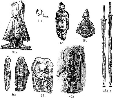 박트리아 지역의 초기 쿠샨왕조의 군주 (우측) 는 동전에 자신을 "위대한 구세주이자 왕중의 왕" 이라고 새기고 있는 이를 기초로 재구성한 것인데, 이 군주는 쿠샨왕조의 첫번째 황제인 쿠줄라 카그피세스 Kujula Kadphises 일지도 모릅니다. 이 그림에서 그는 "두개의 꼭지가 달린" 모자 (tiara) 를 쓰고 있으며, 긴 카프탄 위에 허리까지 내려오는 철제 스케일 아머를 입고 있습니다. (사실 이 인물이 입고있는 갑옷은 몇몇 동전에 나타나 있는 막연한 묘사를 바탕으로 한 것입니다.) 이 인물은 오른손에 뾰족하고 굽은 날, 즉 klevets 이 달린 워 장도리;; 를 들고 있는데, 이 무기는 실제로는 실전용 무기라기보다 권력의 상징으로 쓰였던 것으로 보입니다. (Fig 25c, 26b 참조.)