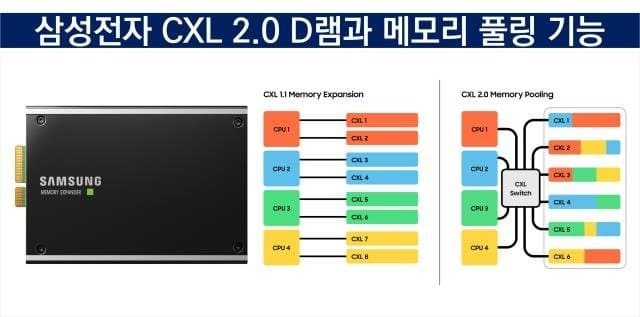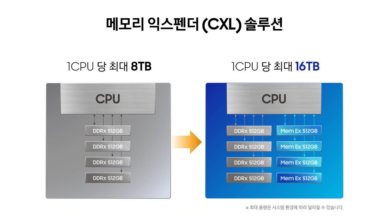 이 기술은 마치 SSD처럼 PCle를 통해 채널 개수를 크게 늘려서 서버 시스템에 훨씬 더 많은 디램 모듈을 탑재할 수 있게 해주는 기술임. 또한 전용 컨트롤러 탑재를 통해 대용량의 디램 용량을 훨씬 더 효율적으로 사용할 수 있게 해줌. 또한 굳이 GPU가 CPU에 종속된 Main Memory까지 가지 않고도 CXL의 Memory Pool을 이용할 수 있게 됨. 또한 다양한 종류의 디램을 시스템에서 같이 활용할 수 있게 해줌. 예컨대 가격이 똥값까지 떨어진 Legacy DDR4 제품을 CXL에 탑재해서 서버 시스템의 SCM으로 활용하는 것임. 이를 통해 서버 시스템의 컴퓨팅 파워를 최대한 극대화하는 방향으로 메모리 구조가 나아가고 있음.
