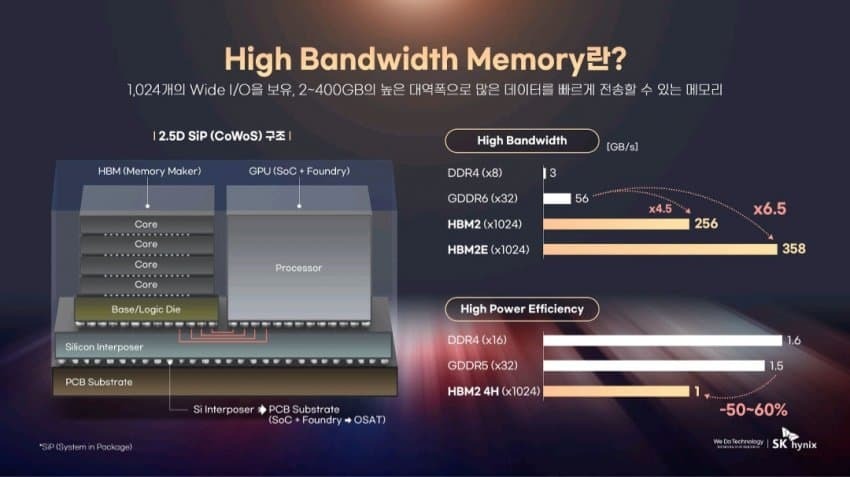 그런데 그때 이후로 다뤄야 할 데이터가 훨씬 더 커지다 보니 이제는 GDDR이라는 고대역폭 디램으로도 컴퓨팅 파워를 감당할 수 없는 지경에까지 이르렀음. 그래서 나온 게 HBM임. 디램을 여러 층으로 쌓고 그것들을 TSV 공정으로 수직으로 서로 연결해서 작은 수평 면적에서 고용량, 고속도, 저전력을 같이 잡은 전용 메모리임. 이제는 GDDR 대신 HBM을 GPU의 Near Memory로 사용하고 있음.