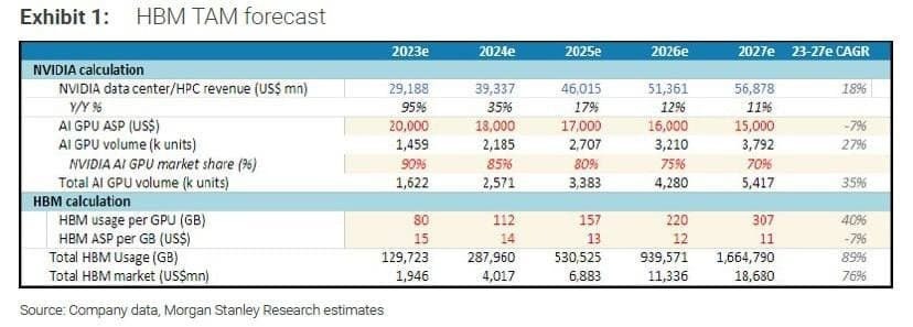 HBM 향후 판매량 전망에서 단순 GPU 출하량 갯수뿐만 아니라 GPU 당 탑재량도 같이 봐야 하는 게 바로 이 때문임. 그래서 첨부한 모건스탠리 리포트에서도 27년 GPU 당 HBM 용량(HBM usage per GPU)을 307GB로 계산했던 것임. 뿐만 아니라 대역폭도 HBM2E(A100)에서 HBM4(차차세대 GPU)로 가면서 몇 배씩 증가한다는 점을 감안하면 GPU의 HBM 전체 성능이 세대가 업그레이드 되면서 수십배 상승한다고 보면 됨. 예컨대 HBM2에서 3으로 가면서 대역폭이 3.2배 상승(256GB/sec->819GB/sec)했다는 점을 감안하면 HBM4의 대역폭 역시 3 대비 최소 3배 이상은 될 것이고, 용량 증가까지 감안하면 엔비디아 차차세대 GPU의 HBM 종합 성능은 H100 대비 거의 20배 가까이 상승할 것으로 전망함. 정말로 어마어마한 성능의 괴물 칩이 출시되는 것임.