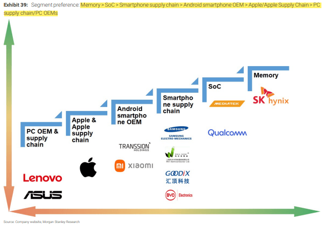 최근자 모건스탠리 리포트에서는 스마트폰의 미래를 온 디바이스 AI라고 엄청 빨아주고 있음. 제 2의 전성기, 이런 표현까지 씀. 온 디바이스 AI의 수혜를 "메모리 > 안드로이드 SoC > 스마트폰 부품 > 안드로이드 OEM > 애플, 아이폰 OEM > PC OEM" 순서대로 많이 입을 것으로 전망함.