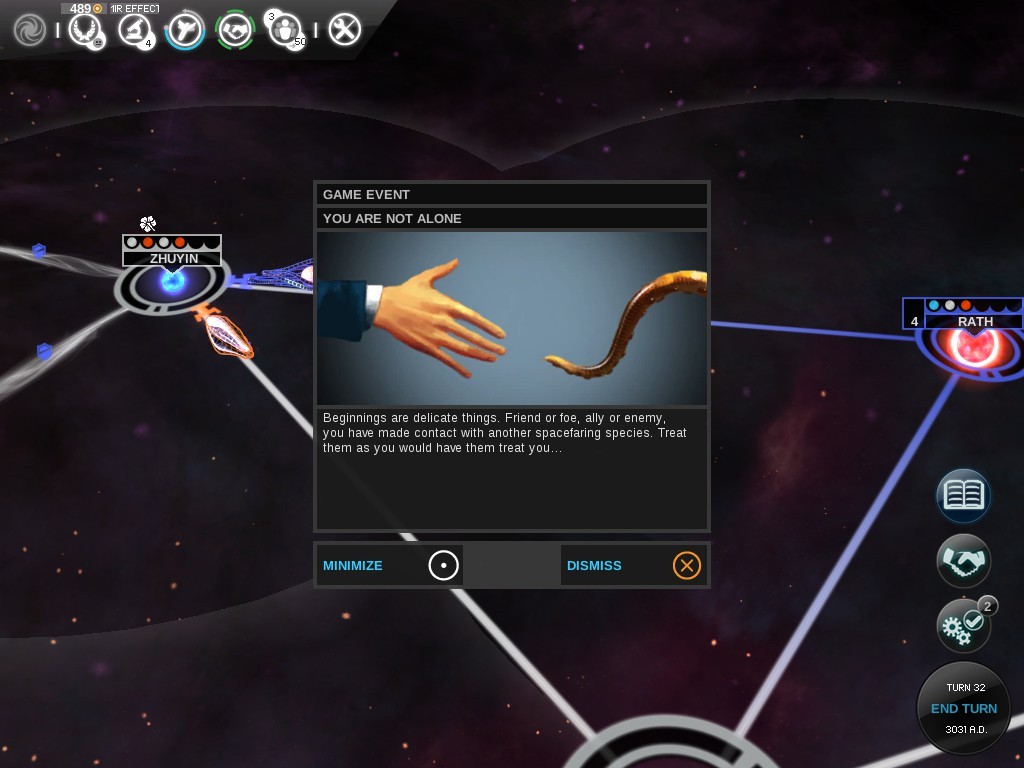 헐 ..너무했다. 난 앞으로 4턴이나 기다려야 휨홀을 건널수 있는데 첫 조우한 이 종족은 벌써 연구를 마치고 ZHUYIN행성계로 넘어 왔다. 아..스블....ㅡㅡ; 우리보다 진보한 종족을 만나 무지 심기가 불편하다.