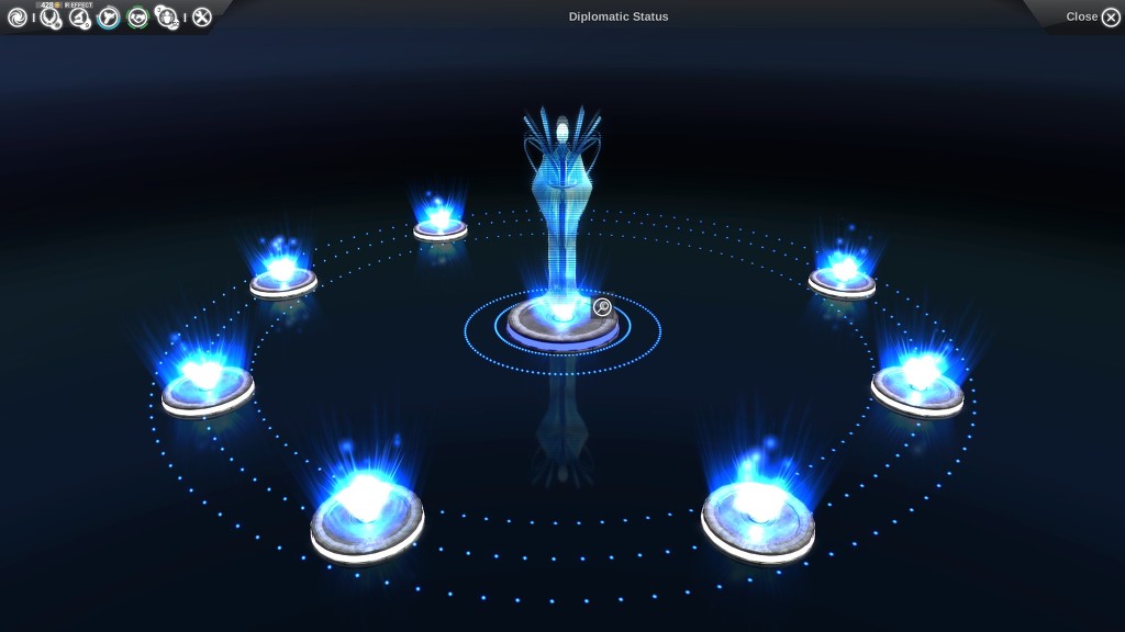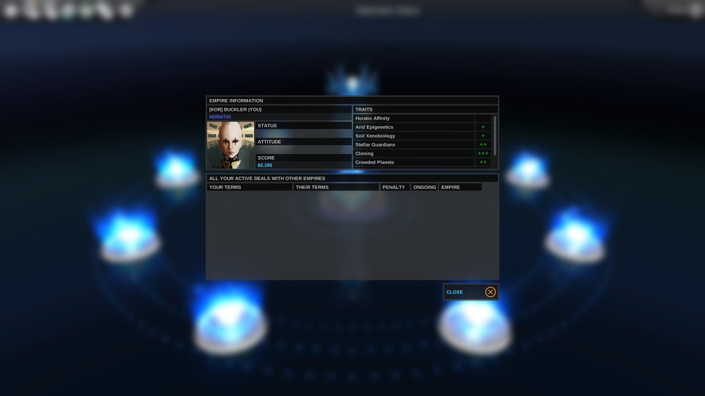 종족 HORATIO (호레이쇼) 를 골라 보았다. 아직 다른 종족을 만나지 못해 외교창에 내 종족만 덩그러니..
