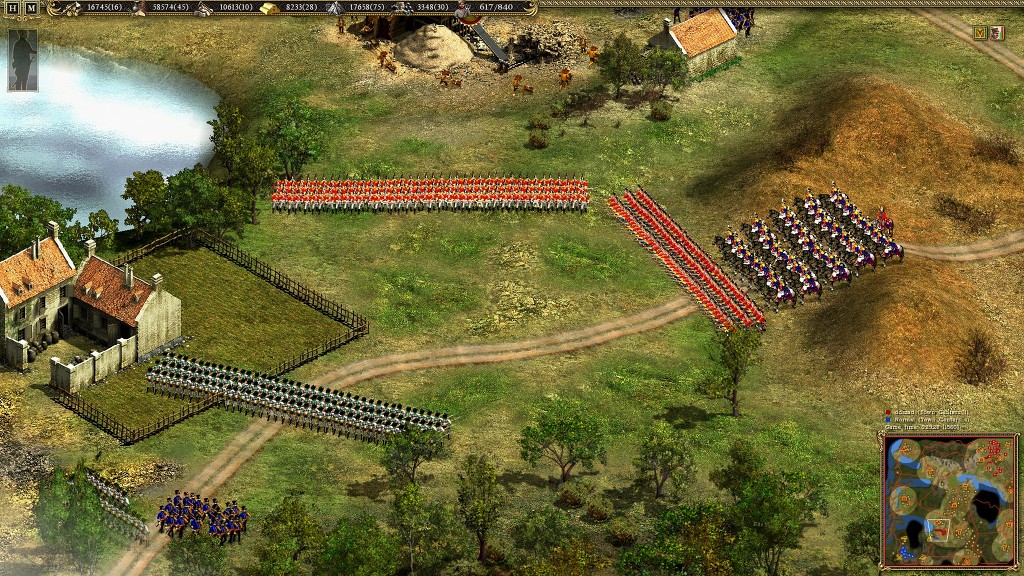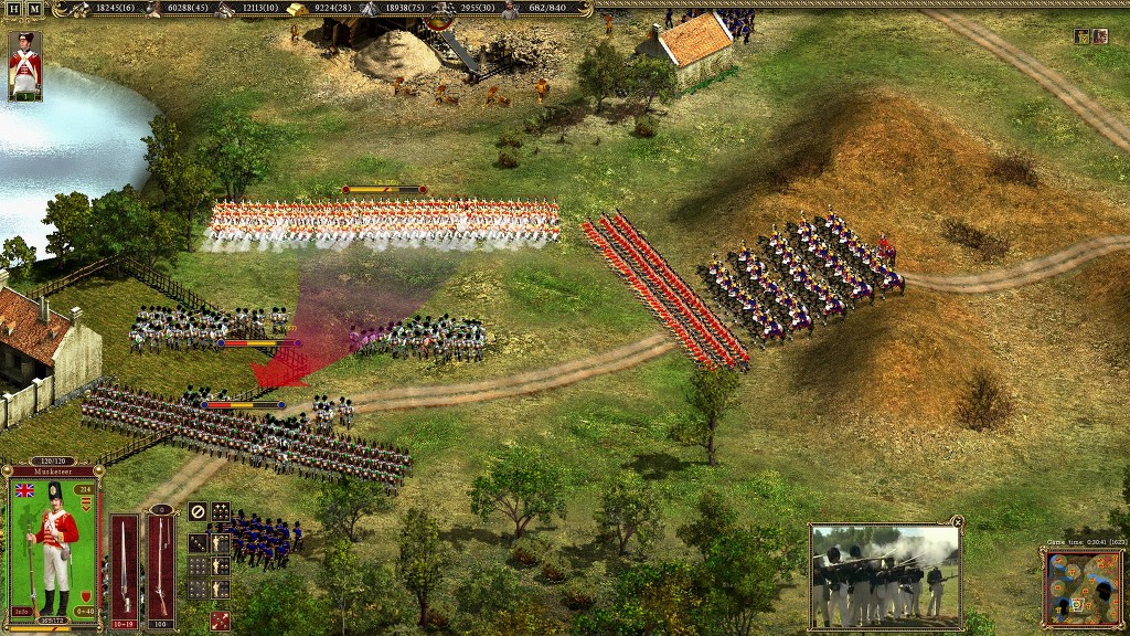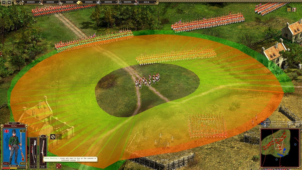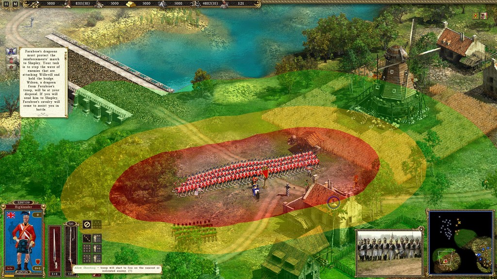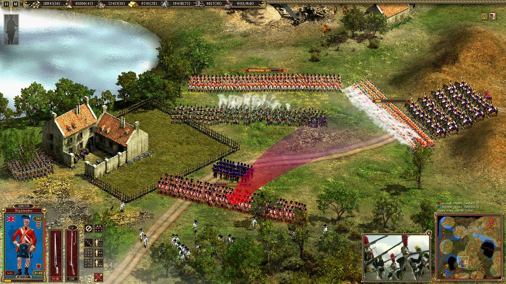 이에 적이 접근을 하여 사격을 개시 하지만 지리적 특성 때문에 일부만 사격을 개시 하게 되고 레드코트 들에게 별다른 피해를 주지 못합니다 게다가 전열을 유지하여 접근해온탓에 사기가 줄어 있습니다 이때를 노려 사격특화 보병인 하이랜더를 이용해
